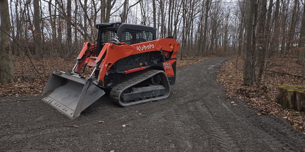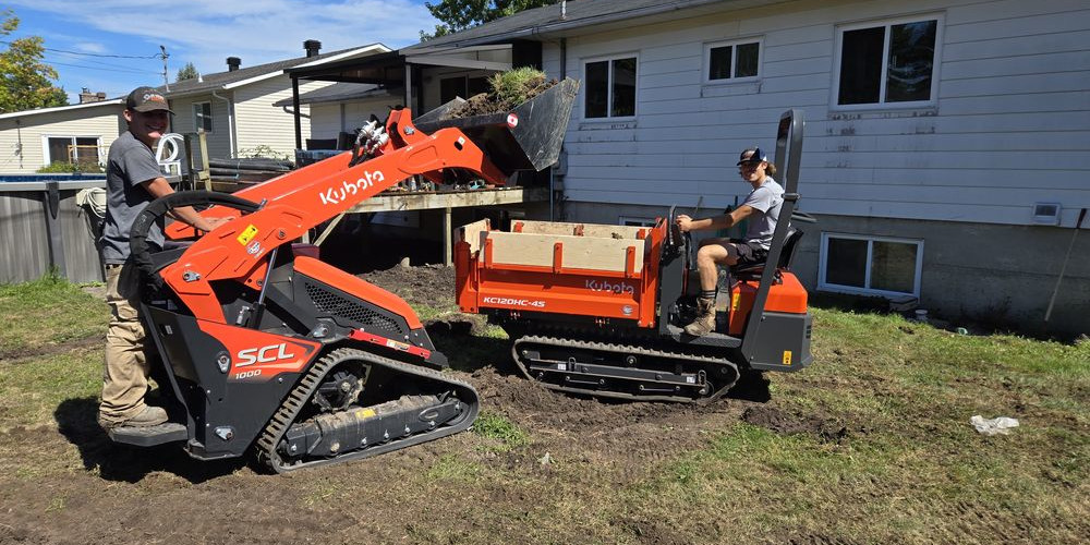 Nivellement grossier : déplacement de volumes avec machinerie (mini-chargeurs, excavatrices), remblayage des points bas et coupe des points hauts.
